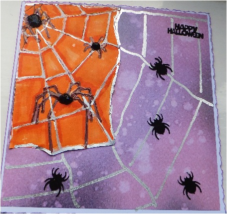 For this card I used a digi from a day for daisies which is the orange part of the card ,After colouring , adding glossy accents and plenty of black stickles to make 3d spiders I then layered it onto a piece of L.C.Designs Splodge Paper pack .I extended the web and added confetti spiders and sentiment .
