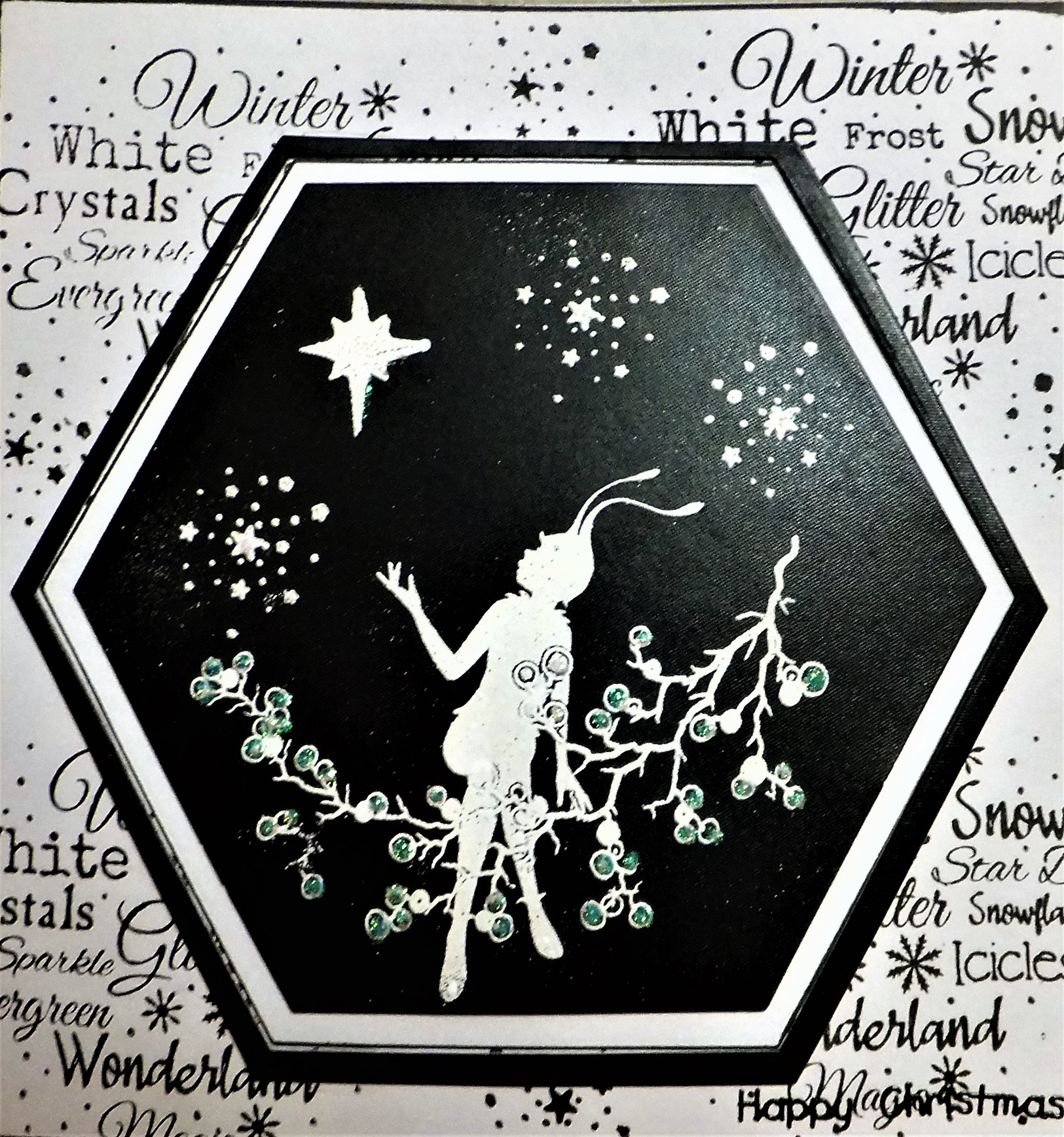I used inks to produce the background for this card . The images are all created by using Lavinia stamps ,mostly from their foliage . The fairy is one of the three dancing fairies stamps . It is coloured with posca pens.To complete I added glitter and liquid pearls .